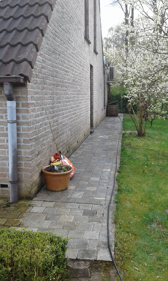 Ontmossen van een tuinpad te Jezus-Eik